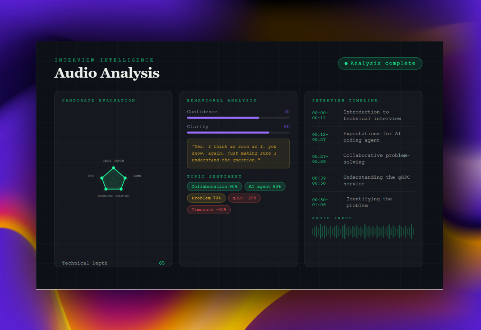 Drop in an interview recording, get a full candidate report in seconds. Produces multi-dimensional scoring across technical depth, communication clarity, and problem solving — with radar charts, behavioral hesitation signals, topic sentiment, and a timestamped interview timeline. Built on a RAG pipeline with FastAPI and React.