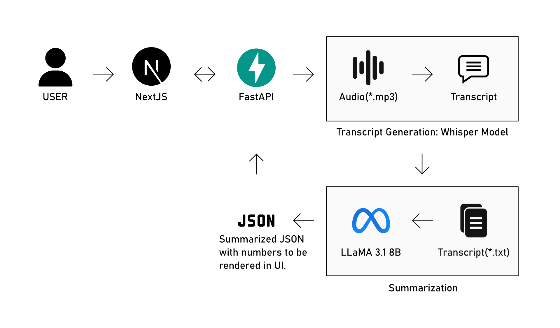 The pipeline takes a raw interview audio file and transforms it into a structured JSON report through two sequential AI stages, orchestrated by a FastAPI backend. Step 1 — Upload: The user uploads an <code>.mp3</code> file through the Next.js frontend, which sends it to the FastAPI backend via a REST call. Step 2 — Transcription (local GPU): FastAPI passes the audio to Open AI Whisper, running locally on a personal GPU. Whisper performs speech-to-text and outputs a raw transcript as a <code>.txt</code> file. Step 3 — Summarization (Groq API): The transcript is sent to LLaMA 3.1 8B via the Groq API, which extracts evaluation metrics — scores, hesitation signals, topic sentiments, timeline segments, and key takeaways. Step 4 — JSON Response: LLaMA returns a structured JSON object with all numbered scores and categorized data ready for rendering. Step 5 — UI Render: FastAPI sends the JSON back to Next.js, which renders the full dashboard — radar charts, progress bars, sentiment chips, and the interview timeline.